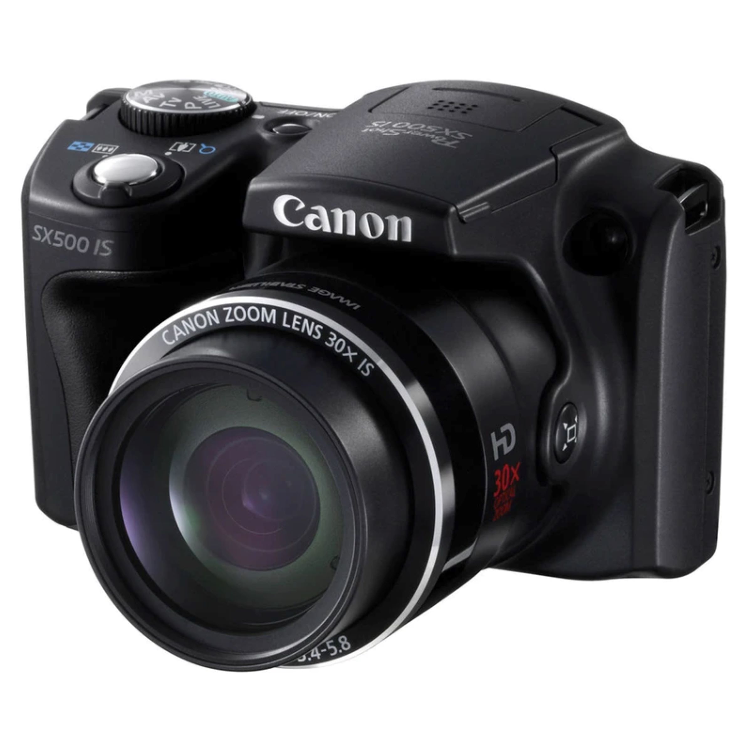 دوربین شبه SLR کانن مدل PowerShot SX500، حسگر با دقت موثر 16 مگاپیکسل، عکاسی پیاپی 0.8 فریم بر ثانیه، فیلمبرداری با رزولوشن HD، نمایشگر ثابت، همراه با لنز 24-720 میلیمتری با بیشترین گشودگی دیافراگم f/3.4-5.8
